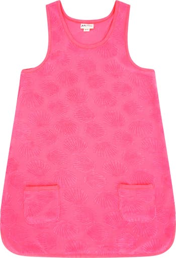 Textured scallop shells cover a bright terry tank dress made with handy pockets and perfect as a cover-up.