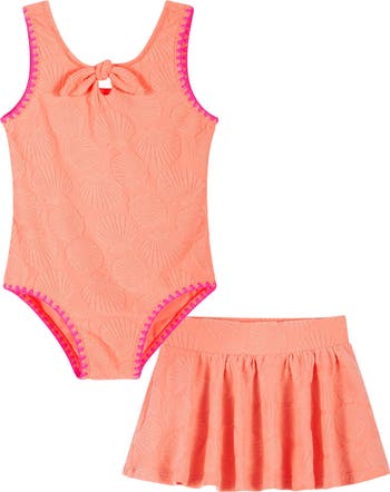 A loopy terrycloth jacquard in a seashell pattern brings beachside fun to this set that includes a skirt and matching one-piece swimsuit edged with bright shell-stitch embroidery.