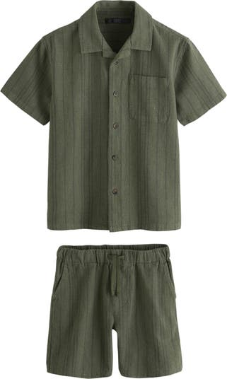 Your kiddo can stay cool without compromising on style in this fresh, breathable cotton-and-linen set featuring a striped camp shirt and a pair of matching shorts.