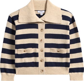 They'll love to layer their look with this striped cardigan made of a supersoft cotton-and-wool blend. It's secured by shiny buttons down the front and features handy patch pockets.