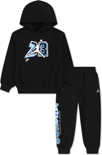 Your budding athlete is ready to take on school days, team practice or simply the couch in the cozy comfort of this cotton-blend fleece set featuring a Jumpman-emblazoned graphic hoodie and matching joggers.