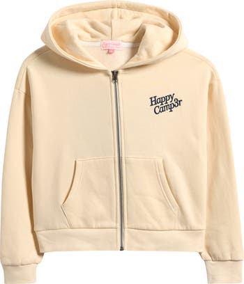 Spread positive vibes in this cozy zip-up hoodie made from a kid-approved cotton blend with dropped shoulders and a relaxed fit.