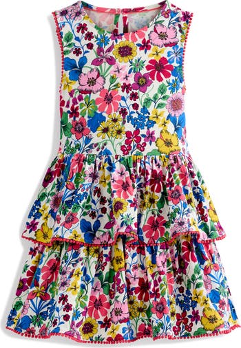 Brighten your child's day in this playfully tiered dress covered in colorful flowers and finished with pompom trim.
