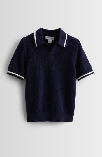A pebbly-textured knit refines a cotton polo-sweater fashioned with a sporty johnny collar and tipped in contrast for a look that will be right at home at the country club.