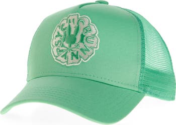 An embroidered logo patch adds signature flair to a kid-approved trucker hat featuring breathable mesh paneling with an adjustable snapback strap for comfortable wear.