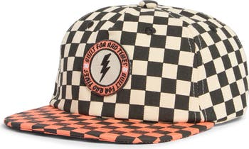 A signature logo patch fronts a boldly checkered baseball hat featuring an adjustable snapback strap to keep your kiddo cool and comfortable.