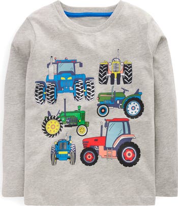 All kinds of tractors show off their big tires on a heathery long-sleeve T-shirt made from soft cotton jersey.