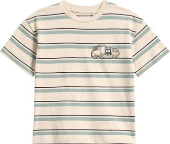 All aboard the outfit express: this soft cotton T-shirt keeps things comfy with neat stripes and a train patch at the chest.