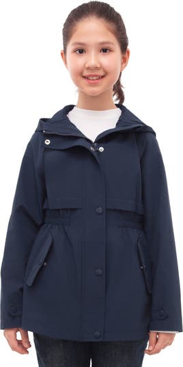 Chic girls’ hooded coat with flap-over-zip, side slip pockets, water-repelling fabric, and a stylish waistline for a modern, flattering look.