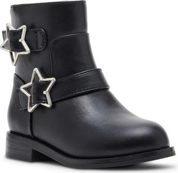 Star-shaped buckles bring out-of-this-world charm to a kid-sized bootie featuring a cushioned footbed and low, stacked heel for playground-ready comfort.