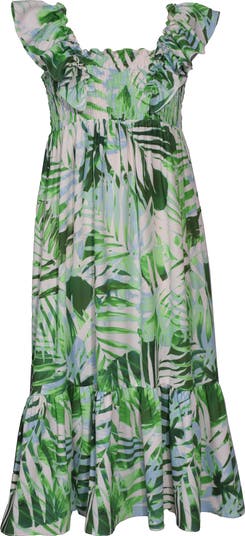 A smocked bodice shapes a flouncy, ruffle-shouldered maxi dress that's printed with tropical foliage to give your child an on-vacation feeling wherever it's worn.