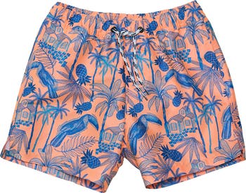Tropical graphics pattern these surf-ready board shorts with an elastic waist for kid-approved comfort.