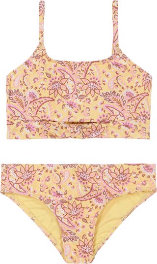 Get your kiddo ready to catch a wave in this two-piece swimsuit featuring a twist-front top and matching bottoms.