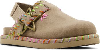 Vibrant stitching lends kid-approved flair to a slip-on shoe designed with an elasticized slingback strap for easy on-offs.