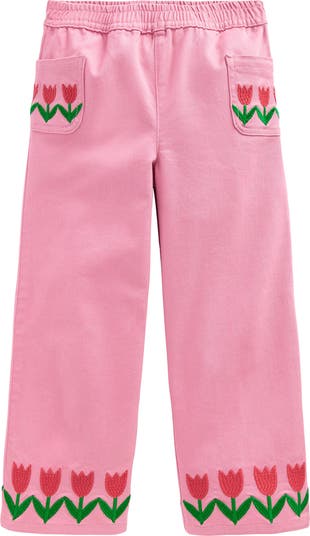 Cheery embroidered tulips delight on denim pants made with a comfy elastic waist and patch pockets.