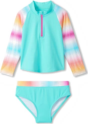 Keep your little one protected from the sun's rays in this colorful beach-themed swimsuit featuring a long-sleeve rashguard top and bold contrast stripes.