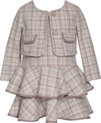 Your child will impress the adults in this tweed double-knit set pairing a flouncy tiered dress with a matching cropped jacket that's finished with jeweled buttons.