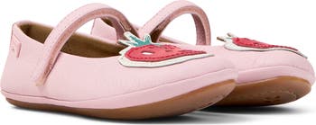 Strawberry appliqués in the label's signature complementary but not identical design sweeten this kid-size flat crafted from smooth leather and set on a flexible rubber sole.