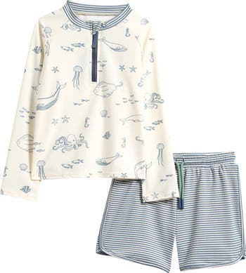 Get your little one ready to splash and play in this swimsuit featuring a protective long-sleeve rashguard and coordinating seersucker trunks.