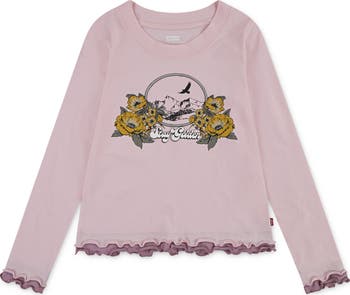 Contrast ruffle trim adds a cute layered effect to a comfy cotton T-shirt that's ready for the playground.