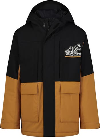 Logo graphics stand out at the chest of a waterproof snow jacket that's ready for the slopes thanks to seam-sealed construction, a snug hood gaiter and adjustable cuffs to keep your kid dry and comfortable.