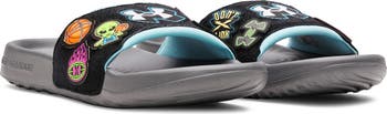 All-day comfortable and popping with personality, this slide sandal pairs full-foot EVA cushioning with a set of interchangeable patches your kid can use to personalize every step. The contoured footbed and grippy sole ground the fun in sure-footed confidence.