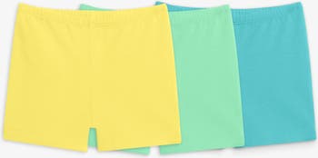 A building block of a kid's closet, known for its softness, quality, and colors in a three-pack. The Kids under short is hemmed just above mid-thigh. Cotton/spandex: 93% cotton/7% spandex 4-way stretch. It is super smooth and comfortable in a snug but comfy fit. If between sizes, size up. Machine wash, tumble dry