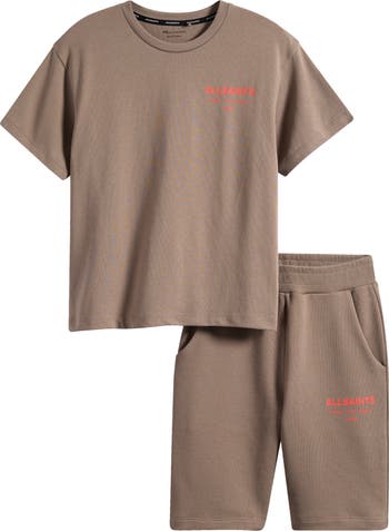 Elevate your kiddo's street style in a matched set that includes longer shorts and roomy T-shirt, all splashed with neon graphics.