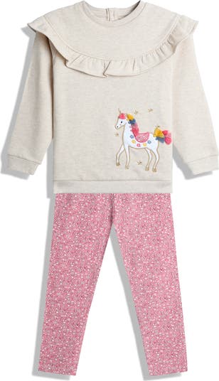Get them ready to play in this supersoft set featuring a ruffled sweatshirt made with a magical unicorn appliqué on the front. It's paired with coordinating leggings that stand out with a bold print.