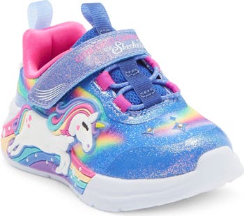 Your little trendsetter is ready to chase unicorns and dreams in this cushioned sneaker boasting colorful rainbows and sparkly details. An adjustable instep strap keeps them moving comfortably all day.