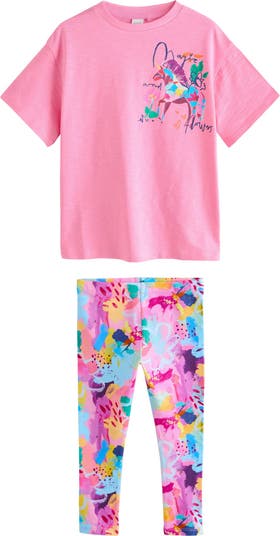 Brighten your child's wardrobe with this whimsical set featuring a graphic short-sleeve T-shirt paired with coordinating color-splashed leggings.