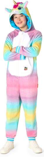 Fuzzy, fantastic and lots of fun, this full-length jumpsuit transforms your human child into a colorful unicorn complete with a golden horn shimmering on the hood. It's made of soft fleece to provide fantasy-soft comfort when the weather gets cold or the weekend needs a little entertainment.