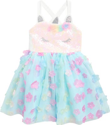 Your kiddo can make an entrance at their next special occasion in this unicorn-themed party dress featuring a glittering sequin bodice and a full skirt embellished with muticolored floral appliquès.