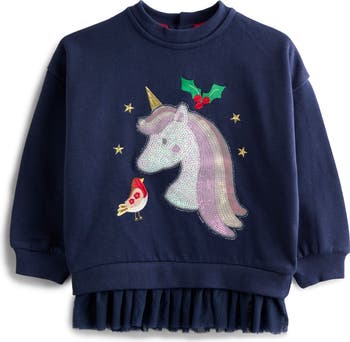 A sequin-embellished unicorn appliqué brings a little sparkle to every adventure in this soft cotton sweatshirt finished with a frilly tulle ruffle at the hem.