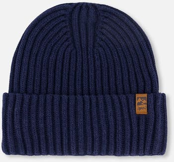 Our Cuffed Knit Hat Navy Blue is a must-have on cool days that require extra layers. Oh-so-soft in 100% cotton, this rib knit beanie hat has a classic look with a rich texture, a bottom cuff, and a signature logo patch. Team with matching mittens for cozy coordination!