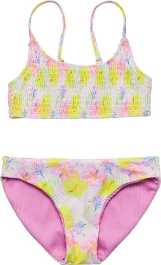 They'll love the versatility of this reversible two-piece swimsuit featuring a captivating, hand-drawn print on one side and a solid design for the reverse.