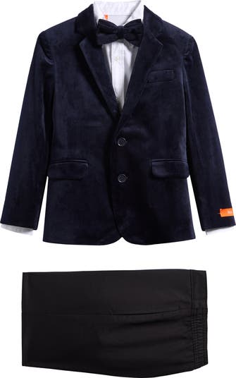 Your kid will look dashing at your next special outing in this dapper set that pairs a velvet dinner jacket with a crisp, white button-up shirt, a matching velvet bow tie and plain-front trousers.