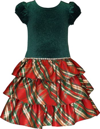 Kids' Velvet & Metallic Plaid Tiered Dress