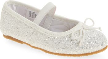 A glitter-encrusted upper and instep bow add whimsical charm to a cushioned flat that's sure to delight your youngster.