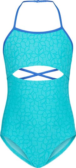 Watch them make a splash as they enjoy the water in this cutout one-piece swimsuit featuring an open back with crisscross straps.