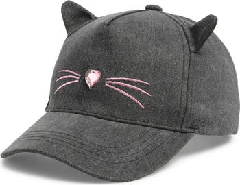 The purrfect addition to any young cat-lover's look: this classic baseball hat takes a playful turn in washed denim embellished with adorable kitten-ear appliqués, embroidered whiskers and a crystal-heart nose.