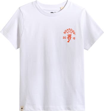 A surf-tastic collage design in bright hues covers the back of this all-cotton T-shirt.