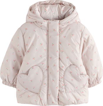 Snowy days are sweeter when your kiddo has a water-resistant puffer jacket covered in tiny blooms and popped with heart-shaped pockets.