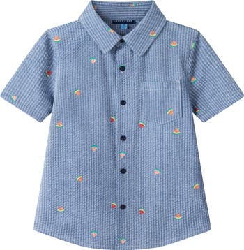 Tiny watermelon slices add a refreshing splash of color to a shirt made of perfectly rumpled seersucker and sized for kids who like to look smart on sunny days. Made in part with breathable cotton, works tucked or untucked to follow your kid's sense of style without sacrificing comfort.
