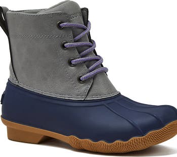 The unofficial boot of puddle jumping, our Waterproof Duck Boot goes to great lengths to keep feet dry. Go ahead, let kids jump in all the puddles with the perfect waterproof boot for wet conditions. Turn bad weather into good memories with a boot crafted with a waterproof rubber sole that keeps feet warm and dry. Keep little feet soak-free with a waterproof faux leather upper, nylon laces and a four-eyelet lace-up front that lets you snug up the boot for a dry, foolproof fit. A rear pull-tab makes for easy pull-on as well. Inside, 400-gram insulation on our padded foam sock keep toes toasty. Your all season go to boots for their little feet. Choose from two colors: Cognac and Gray/Navy.