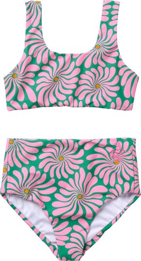 A whimsically wavy floral pattern brings a groovy vibe to your young trendsetter's poolside looks in this two-piece swimsuit complete with retro high-waisted bottoms.