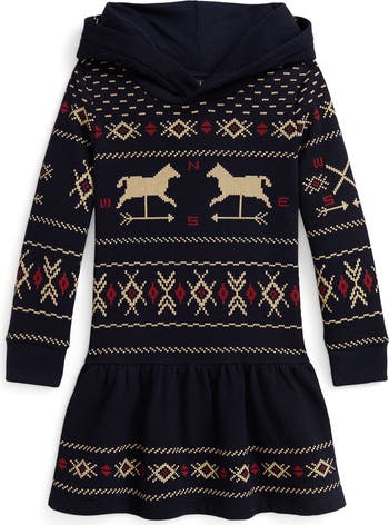 A weathervane jacquard lends out-in-the-country appeal to this comfy fleece sweater-dress that's fashioned with a dropped waist and topped with a roomy hood.