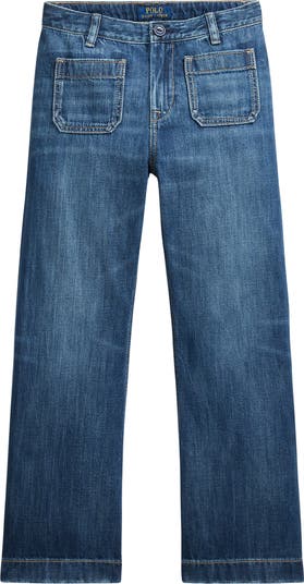 Lightweight, nonstretch denim in a medium wash lends versatility to wide-leg jeans finished with a quad of patch pockets and a stenciled logo on the back.