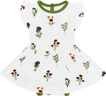 Wispy wildflowers decorate an all-in-one skirted bodysuit framed by flutter sleeves and the perfect look for a sunny day.