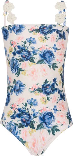 Crochet-embellished straps bring playful energy to this one-piece swimsuit that'll keep them splashing happily all day long.